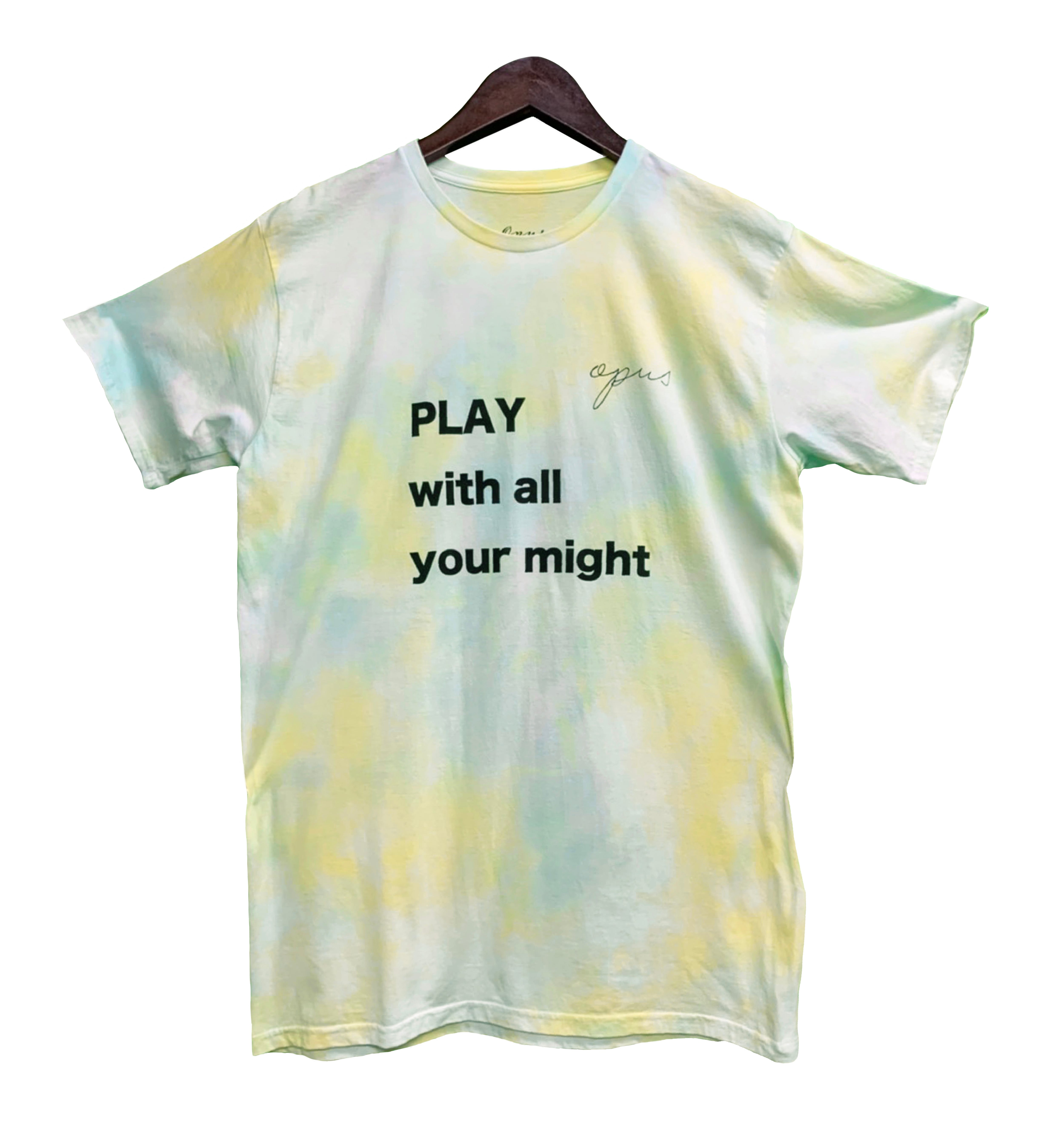 ターコイズブルーとイエローで淡く鮮やかなタイダイに顔料プリントをアクセントに。人と被らない完全一点物。