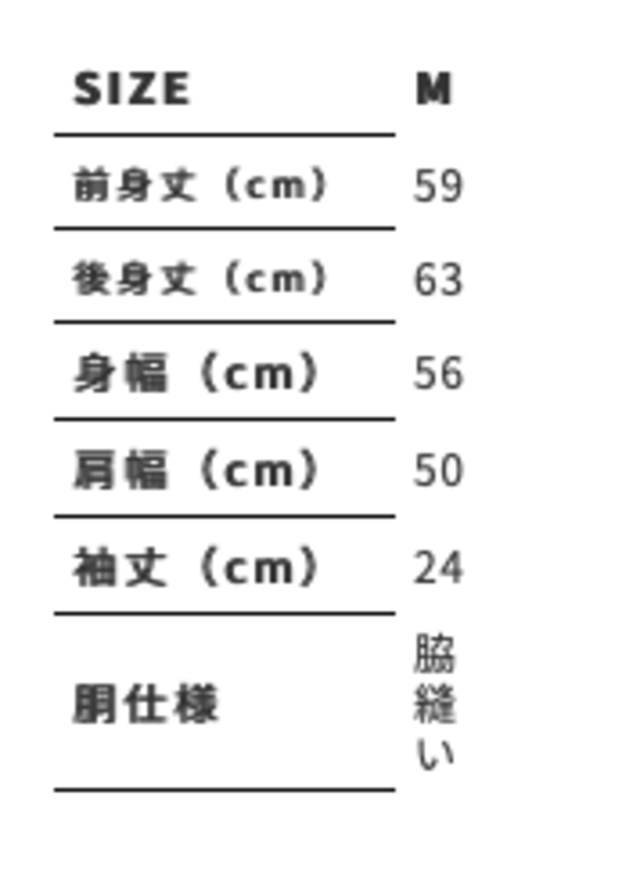 (Mサイズ) 前身丈 : 59cm 後身丈 : 63cm 身幅 : 56cm 肩幅 : 50cm 袖丈 : 24cm