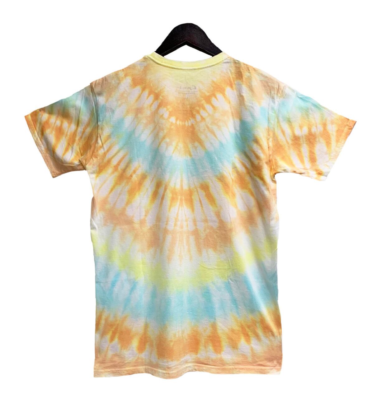 オンレンジ系のグラデーションに差し色でターコイズを入れ、淡く鮮やかな夏らしいタイダイTシャツに仕上げました。人と被らない完全一点物。