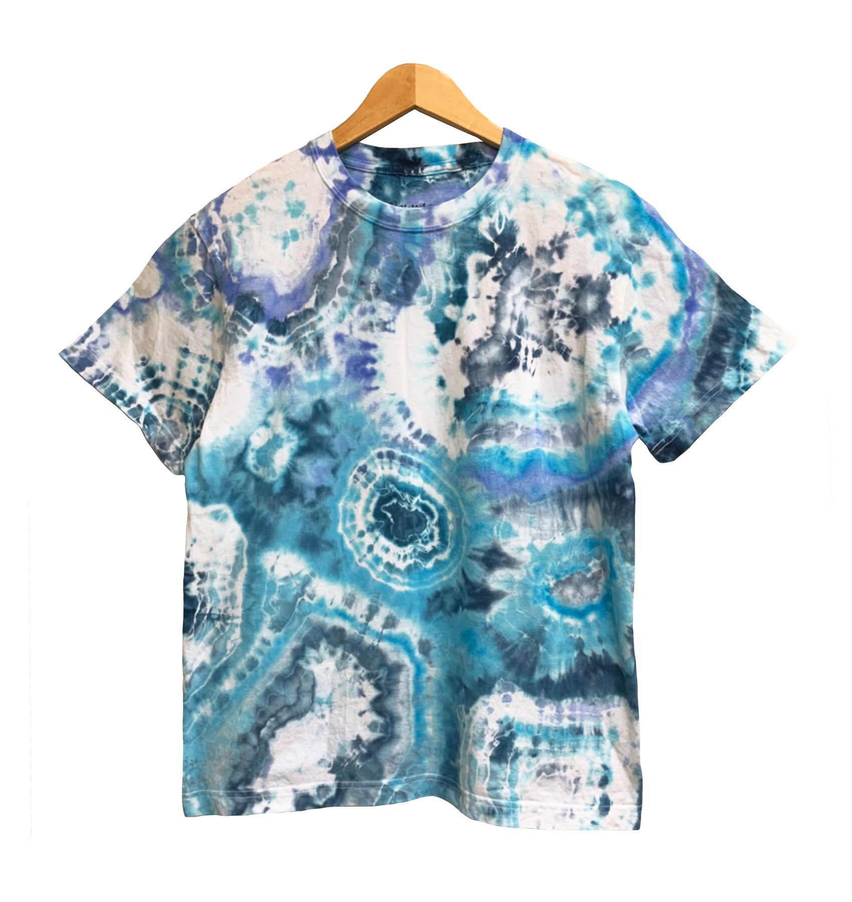 ネイビー・ブルー・ターコイズの染料をICEで溶かしながらジワジワ染めていくため、ICETiedyeならではの風合いを楽しめます。人と被らない完全一点物。