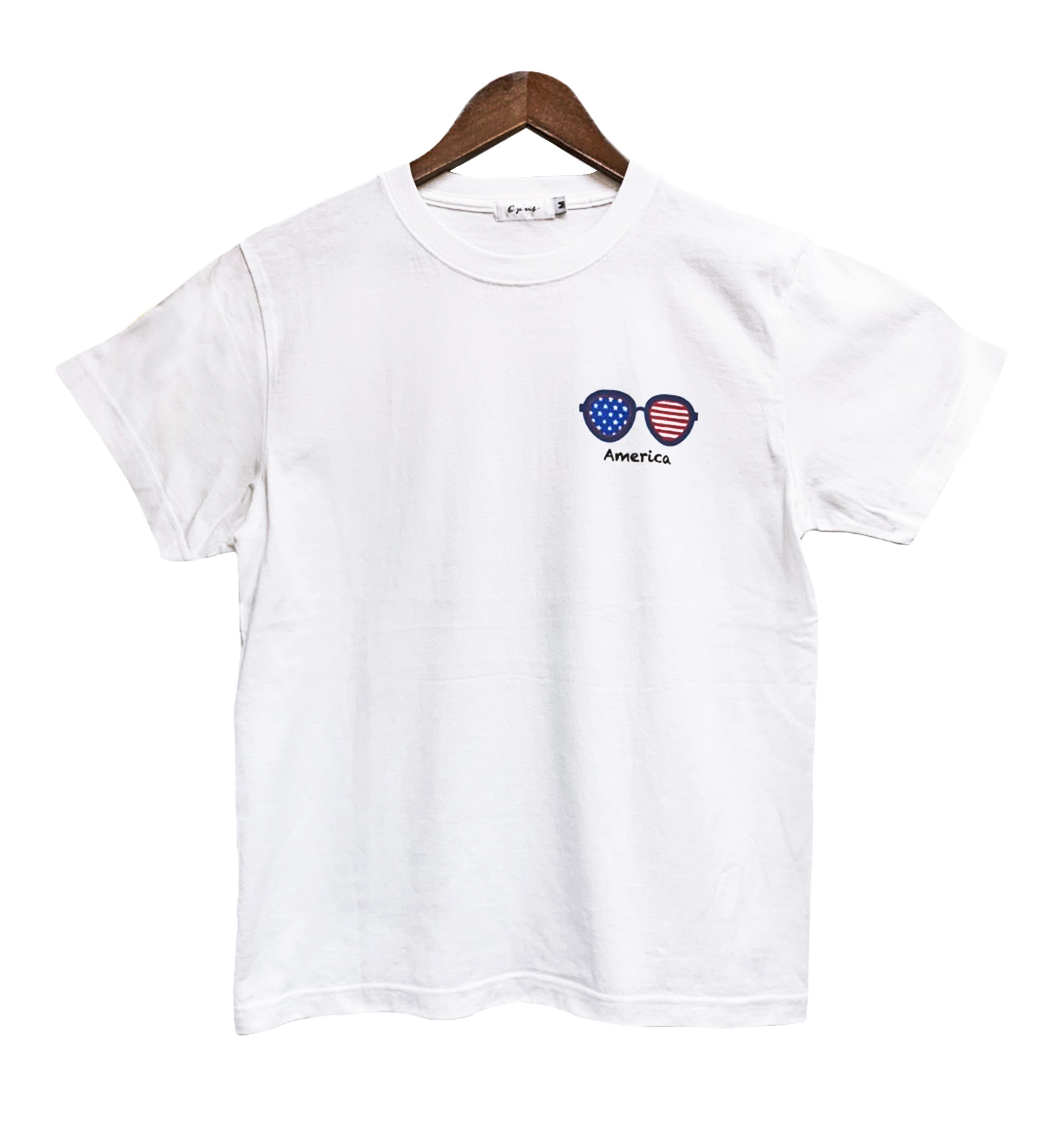 アメリカ国旗をモチーフにしたサングラス柄をインクジェットプリントしました。左胸にさり気なくCuteに仕上がっております。どんなアイテムにも合うTシャツです。