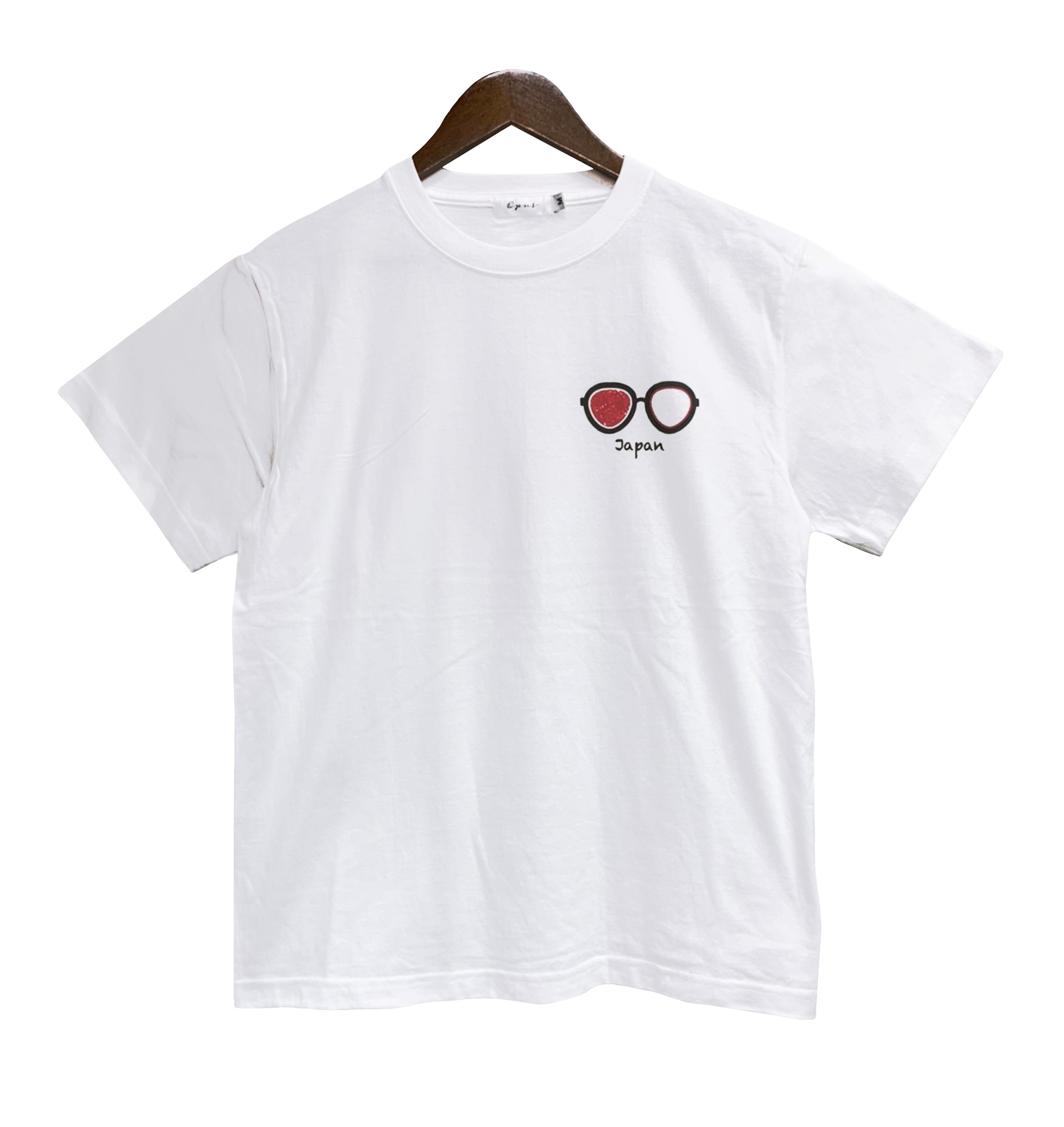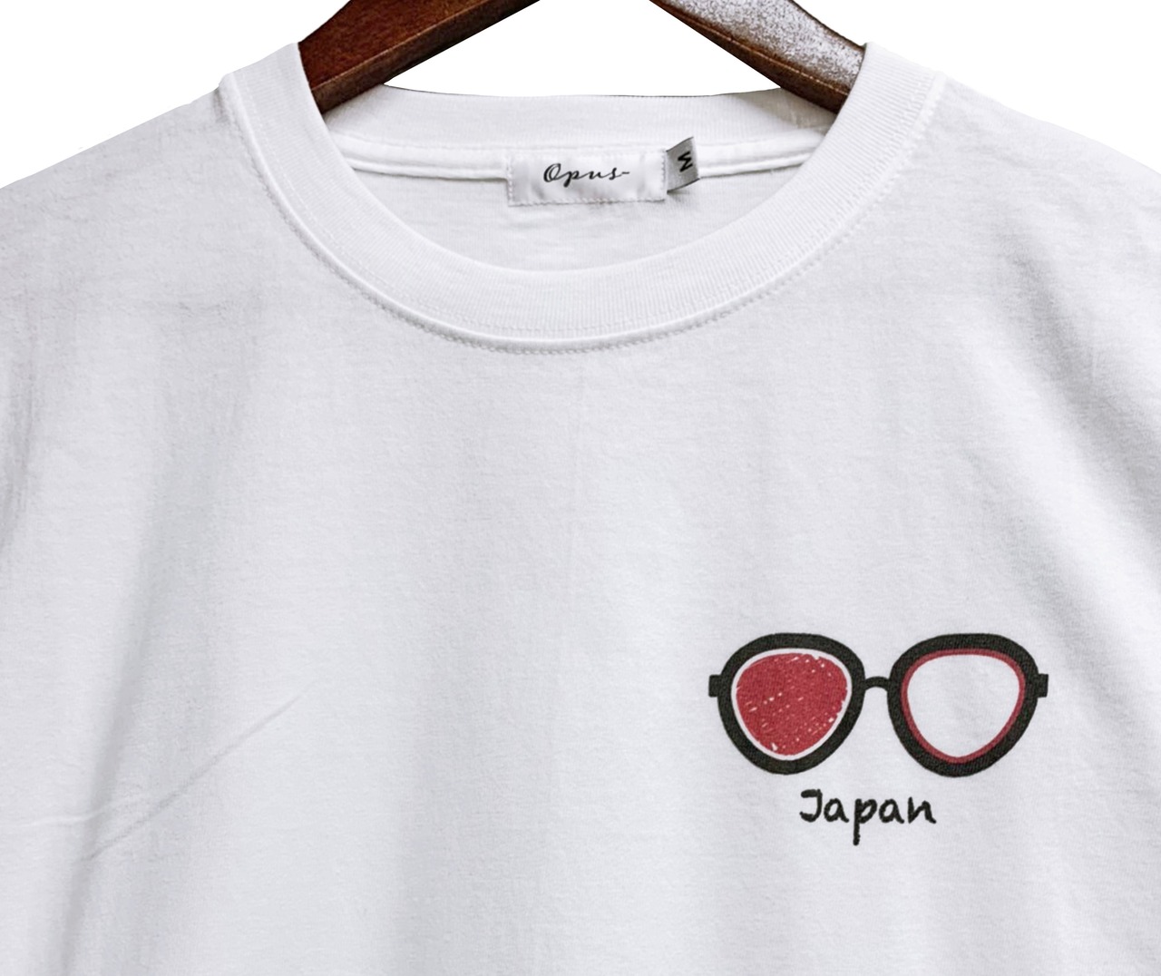 日本の国旗をモチーフにしたサングラス柄をインクジェットプリントしました。左胸にさり気なくCuteに仕上がっております。どんなアイテムにも合うTシャツです。